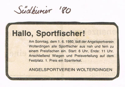 Die 80er Jahre begannen mit großen Umbrüchen für den Verein. 80/81 wurden die Beiträge neu festgelegt. Tages- und Wochenkarten wurden auf 15,-, bzw. 50,- DM festgelegt. Die Jahreskarten fur Gastfischer wurden auf 150,- DM, der Beitrag für Jungfischer auf 75,- DM festgelegt (später auf 100,- erhöht). Jungfischer die nach dem 18. Lebensjahr als Gastfischer aufgenommen wurden mussten 100,- DM Aufnahmegebühr und 100,- DM Jahresbeitrag bezahlen. Der Jahresbeitrag für Vollmitglieder wurden 81 von 100,- auf 200,- DM erhöht. Die Beiträge für französische Gastfischer wurden ebenfalls auf 200,- DM erhöht. 1980 fand das erste große Fischerfest mit Preisfischen unter der alleinigen Regie des ASV Wolterdingen statt (siehe Zeitungsanzeigen).