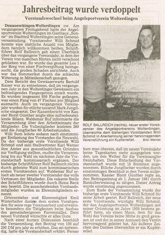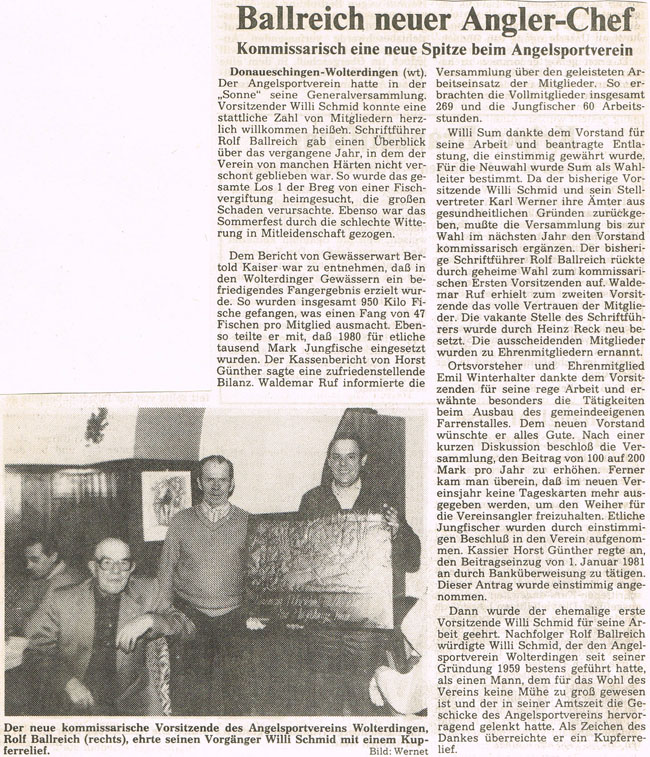 Ende 1980 kündigten der 1. und 2. Vorsitzende Willi Schmidt und Karl Werner an, nicht für eine weitere Amtszeit kandidieren zu wollen. Und so kam es bei der Generalversammlung am 20.01.1981 zu Neuwahlen. Dabei wurde Rolf Ballreich zum kommisarischen 1. Vorstand, Waldemar Ruf wurde 2. Vorstand und Heinz Reck zum Schriftführer gewählt. Kassierer war zu diesem Zeitpunkt bereits Horst Günther. Gewässerwart blieb Berthold Kaiser. Als erste Amtshandlung nahm Rolf Ballreich die Ehrung von Willi Schmidt für die 21 jährige Amtszeit als 1. Vorstand vor. Als Zeichen der Anerkennung wurde Willi Schmidt ein Kupferrelief überreicht. Ebenfalls geehrt wurde Karl Werner für seine 4 jährige Amtszeit. Außerdem wurden die geehrten zu Ehrenmitgliedern des ASV ernannt.