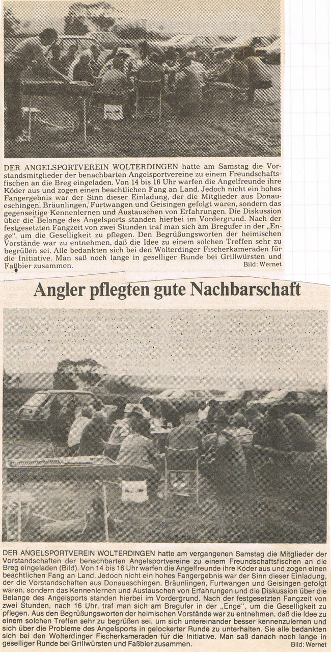 Neben dem Fischerfest am 21. Juni 1981 (siehe letzter Zeitungsartikel "Schlechtes Wetter - schlechter Fang" oben) fand am 29.08.81 auch ein Kameradschaftsfischen statt, zu dem je 5 Mitglieder der Vorstandschaften der Angelsportvereine Donaueschingen, Bräunlingen, Furtwangen und Geisingen geladen waren (siehe Zeitungsartikel unten).