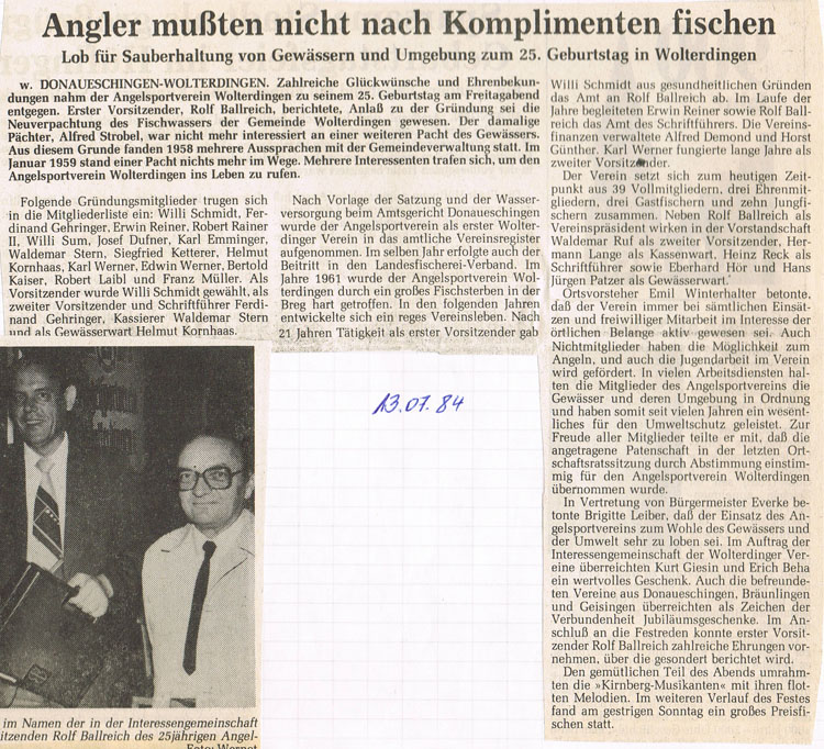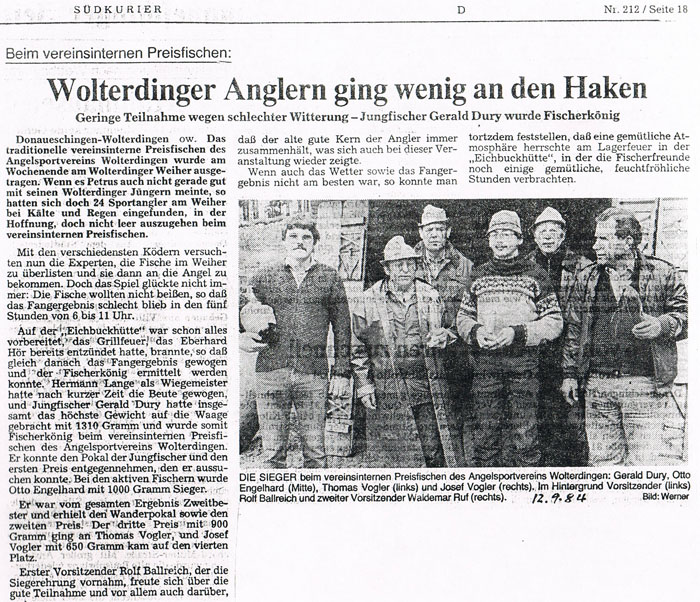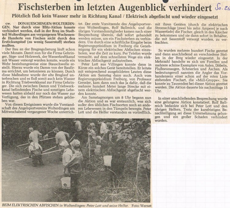 Doch auch das Jahr 1984 war nicht nur vom positiven gezeichnet, so kam es im Rahmen der Bregregulierung zu einer Unterbrechung des alten Breglaufes, was zur Folge hatte das alle Fische auf dem betreffenden Stück bedroht waren. Durch eine Blitzaktion des Vereins wurden diese elektrisch abgefischt und in fließendes Gewässer eingesetzt (siehe Zeitungsartikel unten).